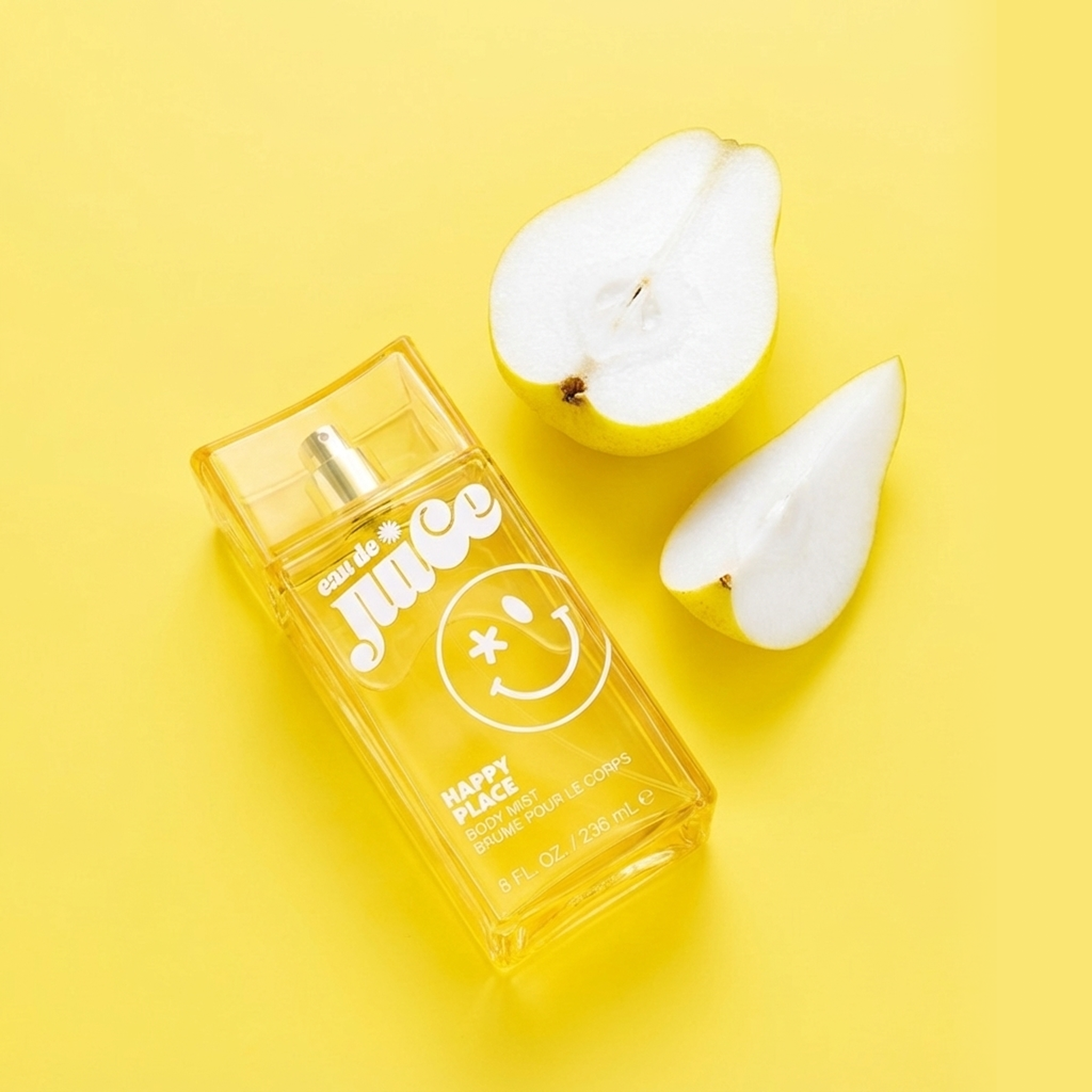 Optimistic, light hearted & adventurous! Eau de Juice Happy Place Body Mist dives in with a solar splash of passionfruit blended with sparkling pear and mouth-watering Faceted addictions.